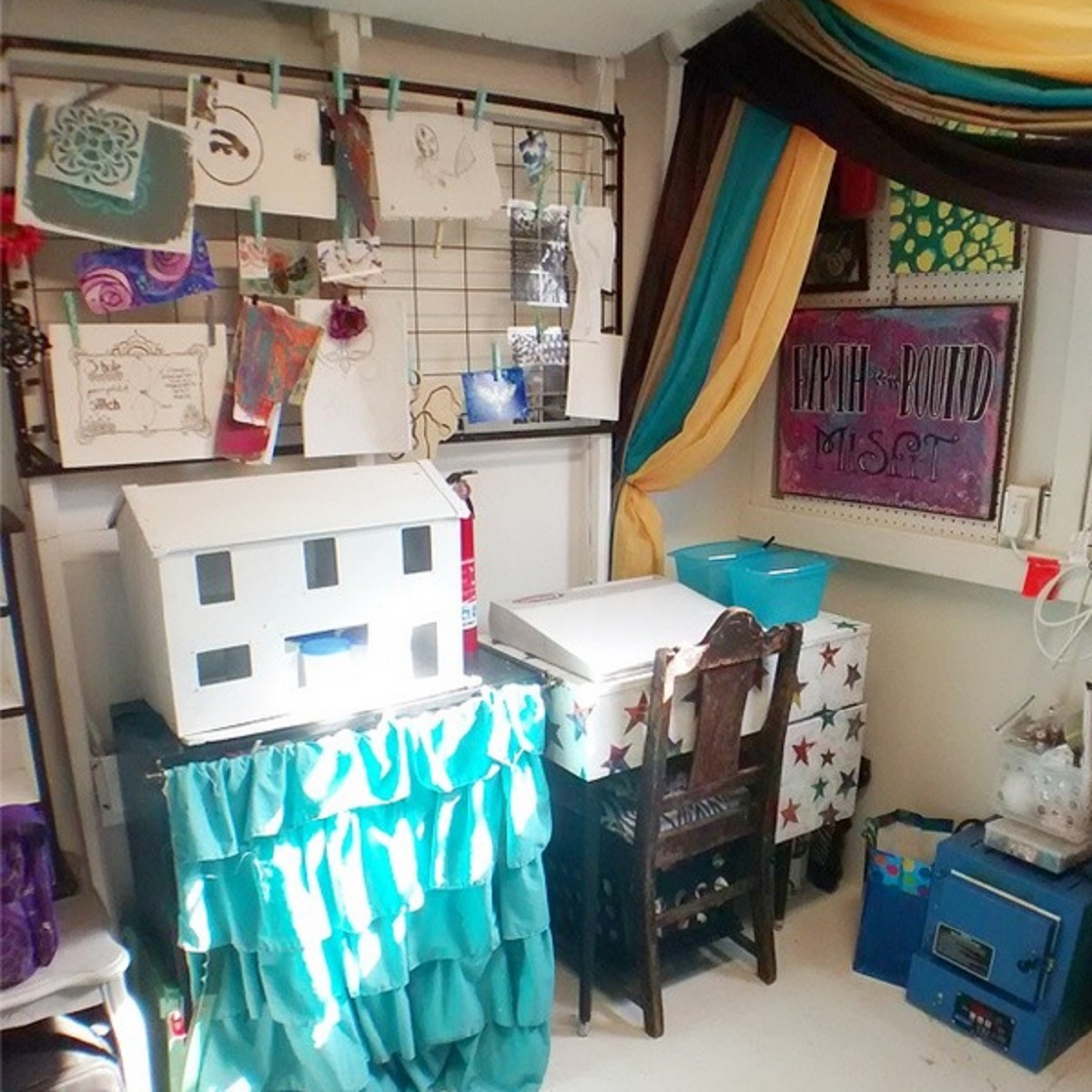 This corner needs work!  I'll be taking out that little table to the far left, moving everything over, and putting in a roll cart to hold my kiln and the items on my desk.  I'm in the process of painting that dollhouse.  It was mine when I was a little girl, but it got very rusted and scratched up and needed to be repainted.  Not sure what I will do with it yet.